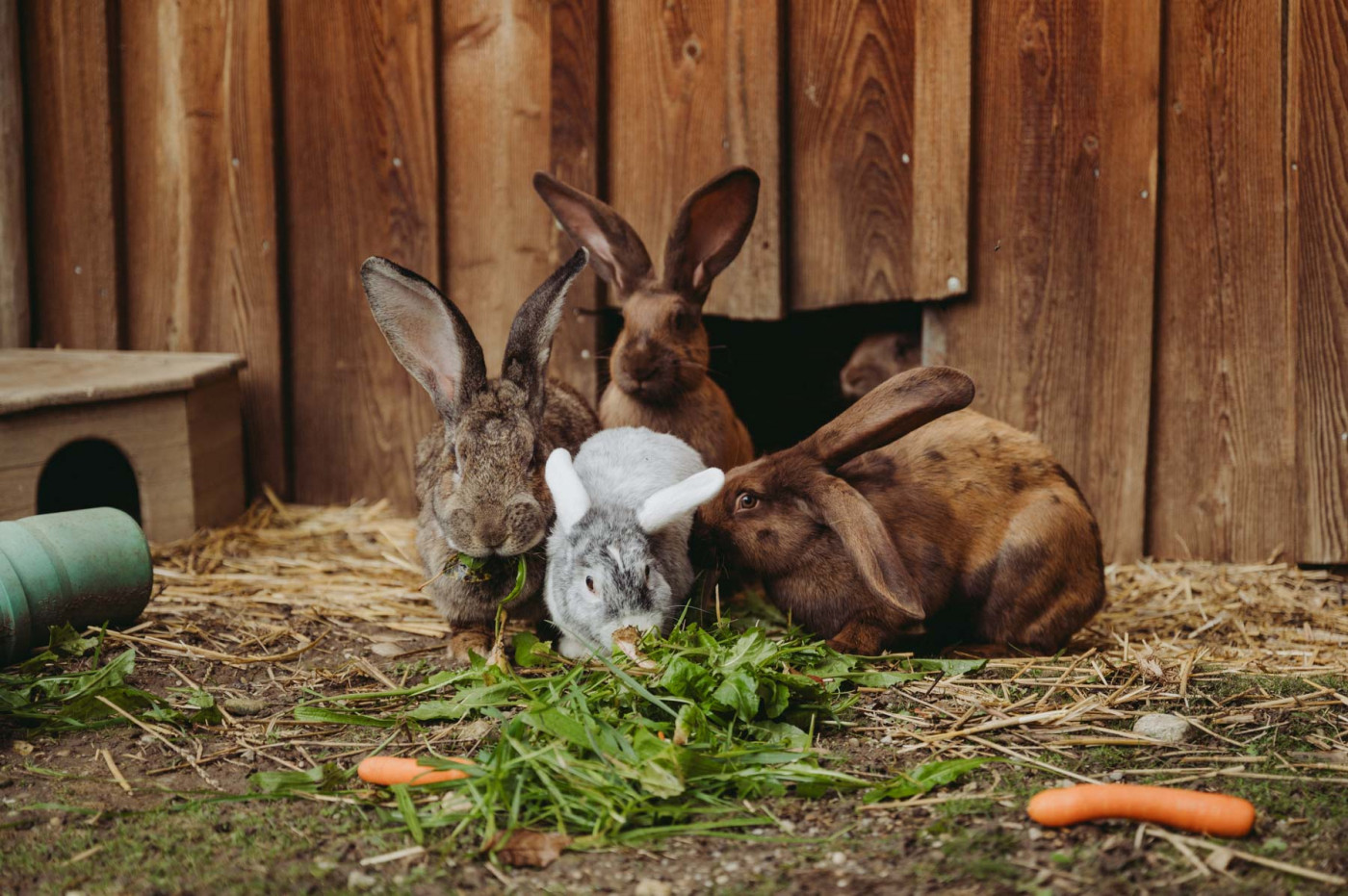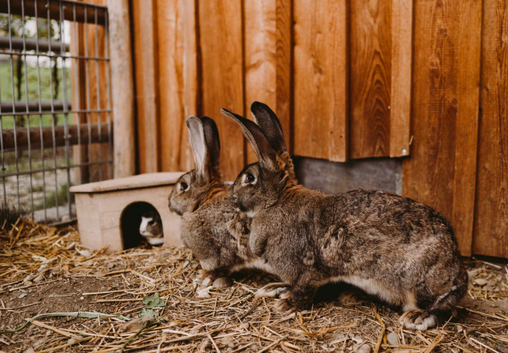 Unsere deutschen Riesen zählen zu den größten bekanntesten Kaninchenarten. Deutsche Riesen können ein Gewicht von 4 bis 6 kg erreichen, manche Exemplare sogar noch mehr. Sie haben einen robusten Körperbau und große, aufrechte Ohren. Sie sind besonders zutraulich und haben ein ruhiges Wesen. Deshalb kommen sie auch sehr gut mir ihren Mitbewohnerinnen, den Meerschweinchen, zurecht, die den gemeinsamen Auslauf und das Erkunden des Geheges besonders bei Sonne lieben.