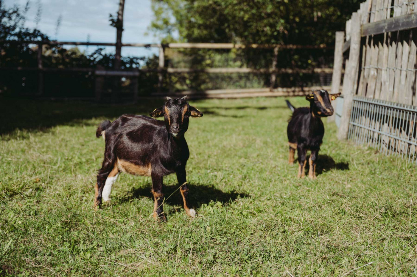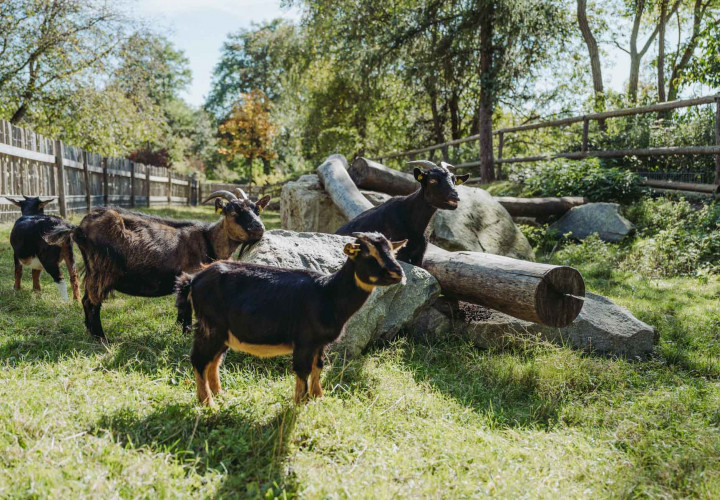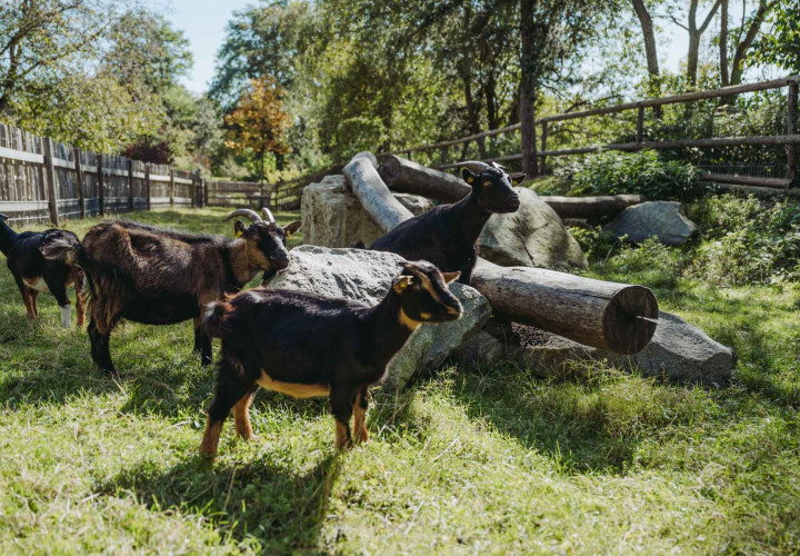 Laut und wild geht es bei unseren Ziegen oft zu. Extrem zutraulich und neugierig halten sie sich gerne in der Nähe des Zauns auf, sobald Besucherinnen auftauchen.