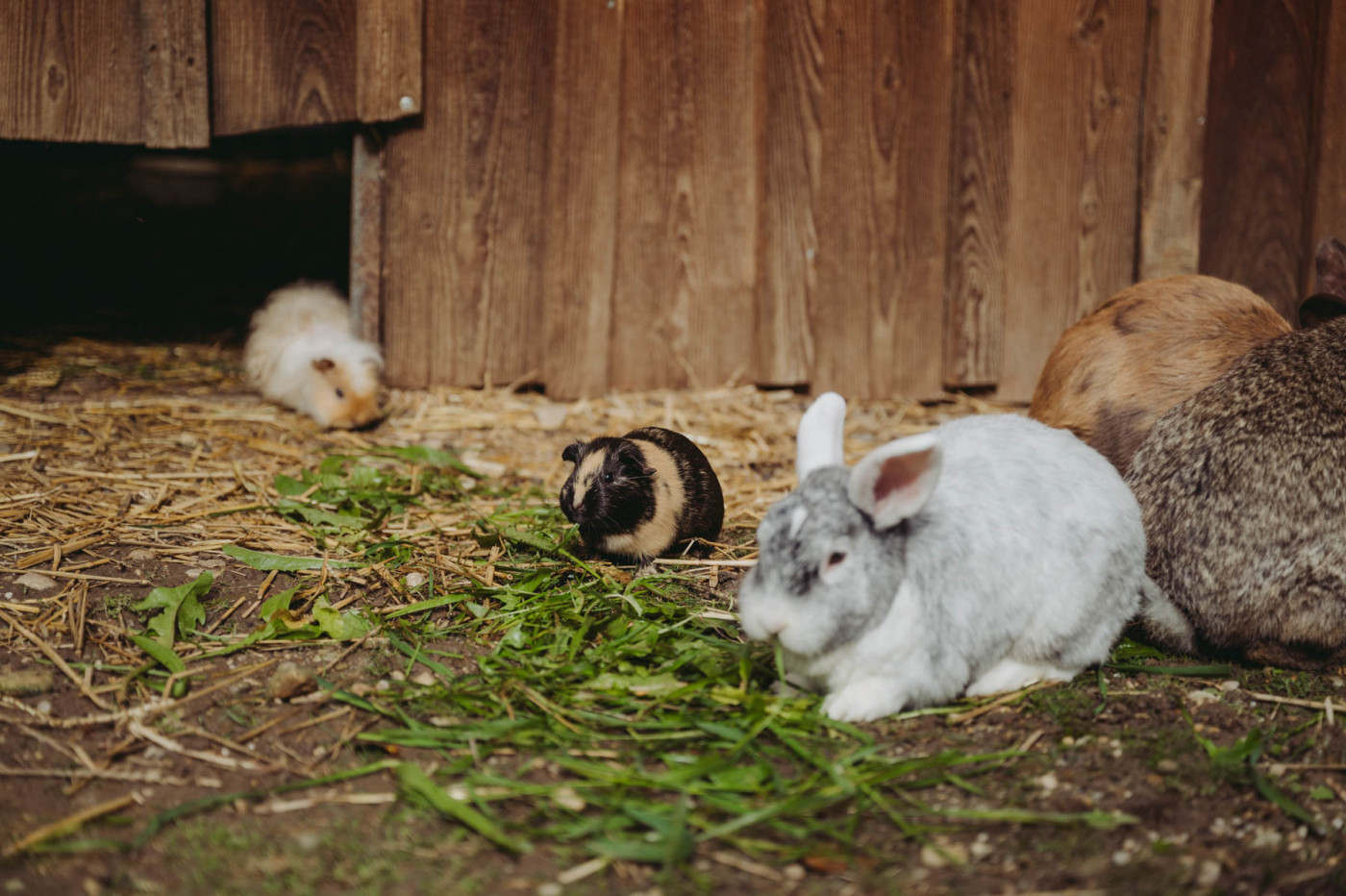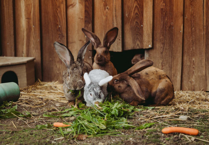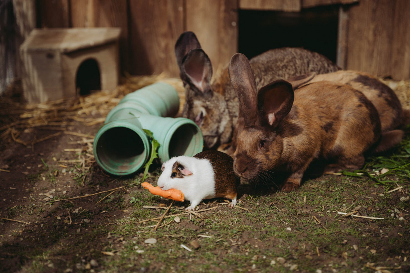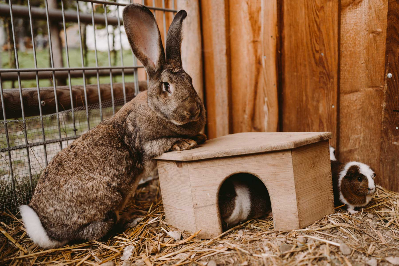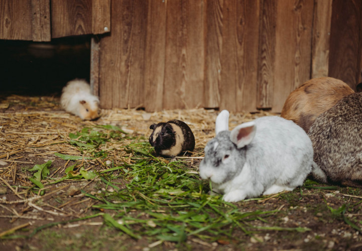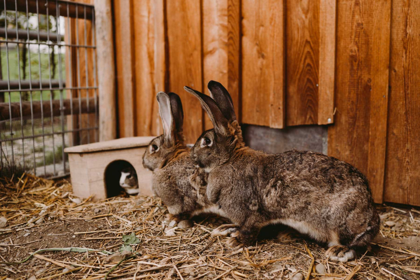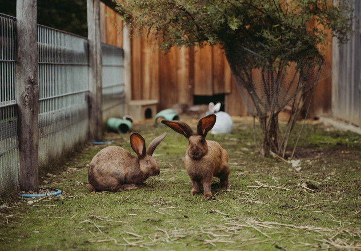Unsere deutschen Riesen zählen zu den größten bekanntesten Kaninchenarten. Deutsche Riesen können ein Gewicht von 4 bis 6 kg erreichen, manche Exemplare sogar noch mehr. Sie haben einen robusten Körperbau und große, aufrechte Ohren. Sie sind besonders zutraulich und haben ein ruhiges Wesen. Deshalb kommen sie auch sehr gut mir ihren Mitbewohnerinnen, den Meerschweinchen, zurecht, die den gemeinsamen Auslauf und das Erkunden des Geheges besonders bei Sonne lieben.