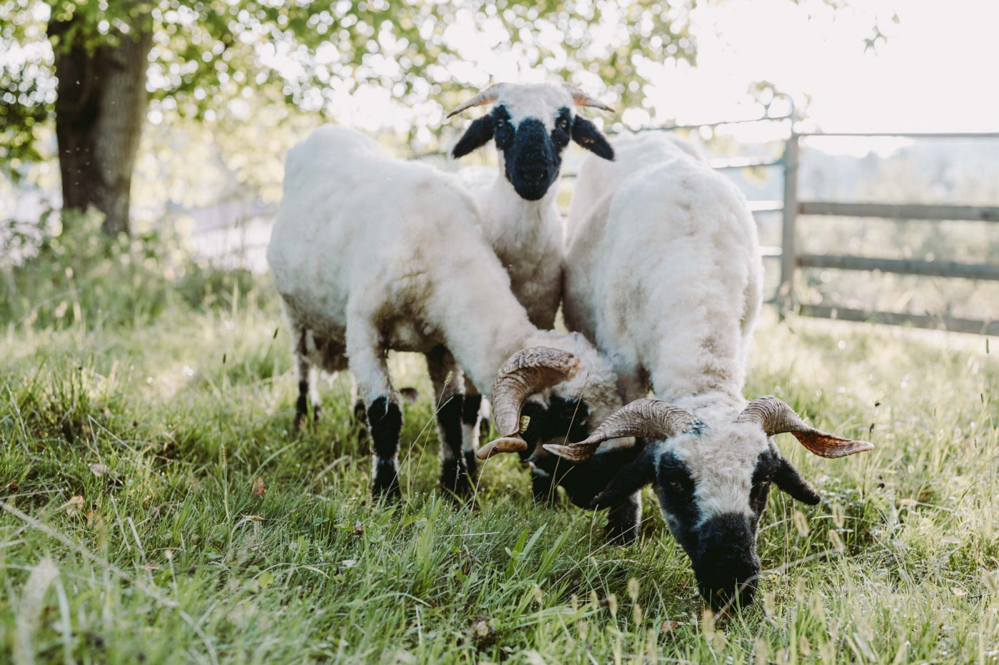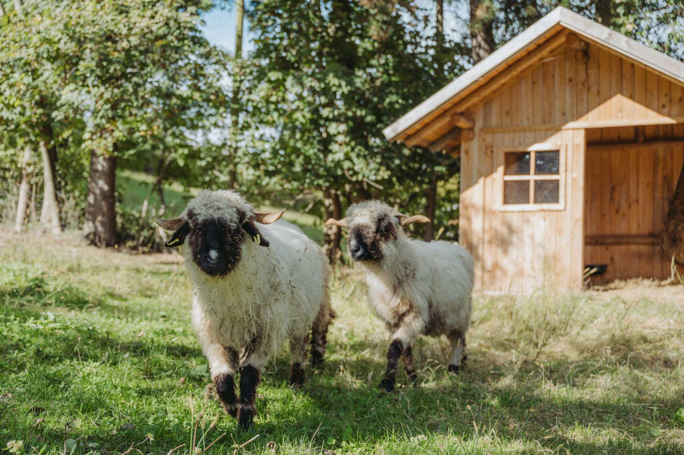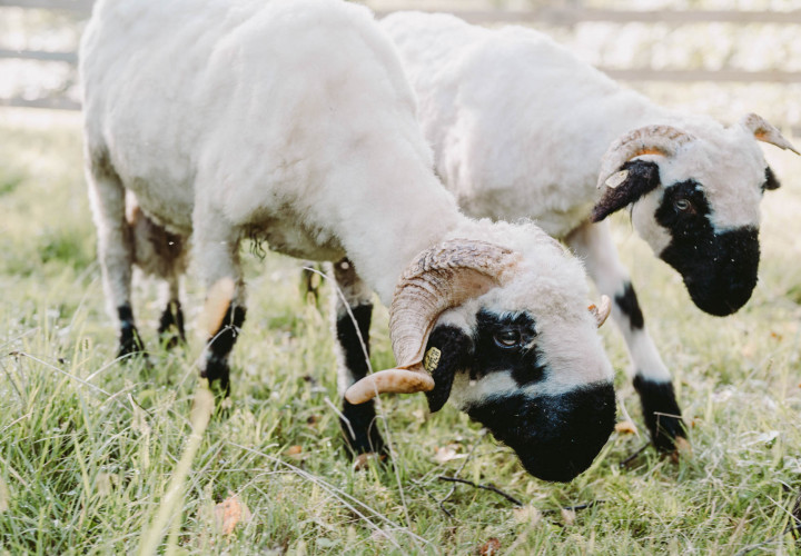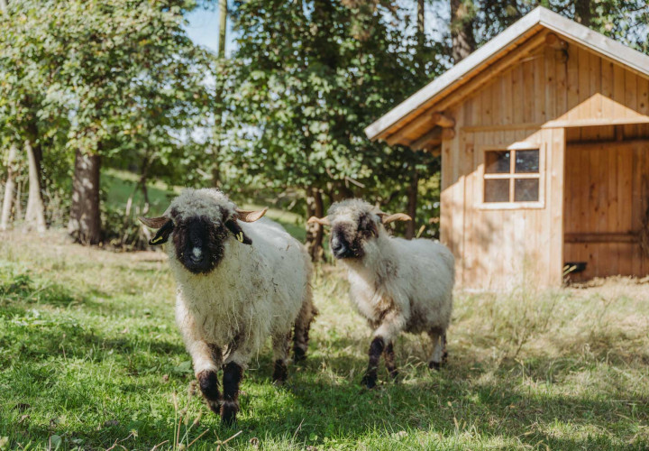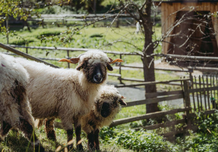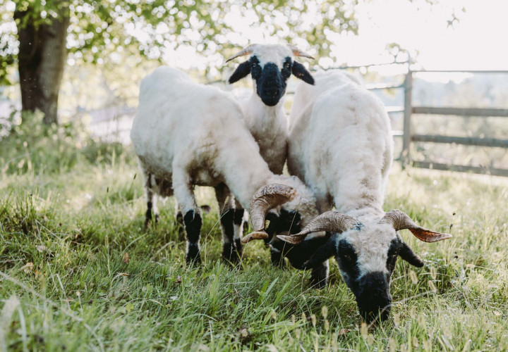 Im Gehege der Schafe geht es immer gemächlich zu: Unsere Walliser Schwarznasen, die für ihre schwarzen Beine und Nasen auffallen, der sich deutlich vom lockigen weißen wolligen Körper abheben, lassen sich selten aus der Ruhe bringen. Die Rasse stammt aus dem Schweizer Kanton Wallis. Das Schwarznasenschaf war noch vor einigen Jahrzehnten eine seltene und gefährdete Rasse - ihr Bestand hat sich inzwischen gut erholt.