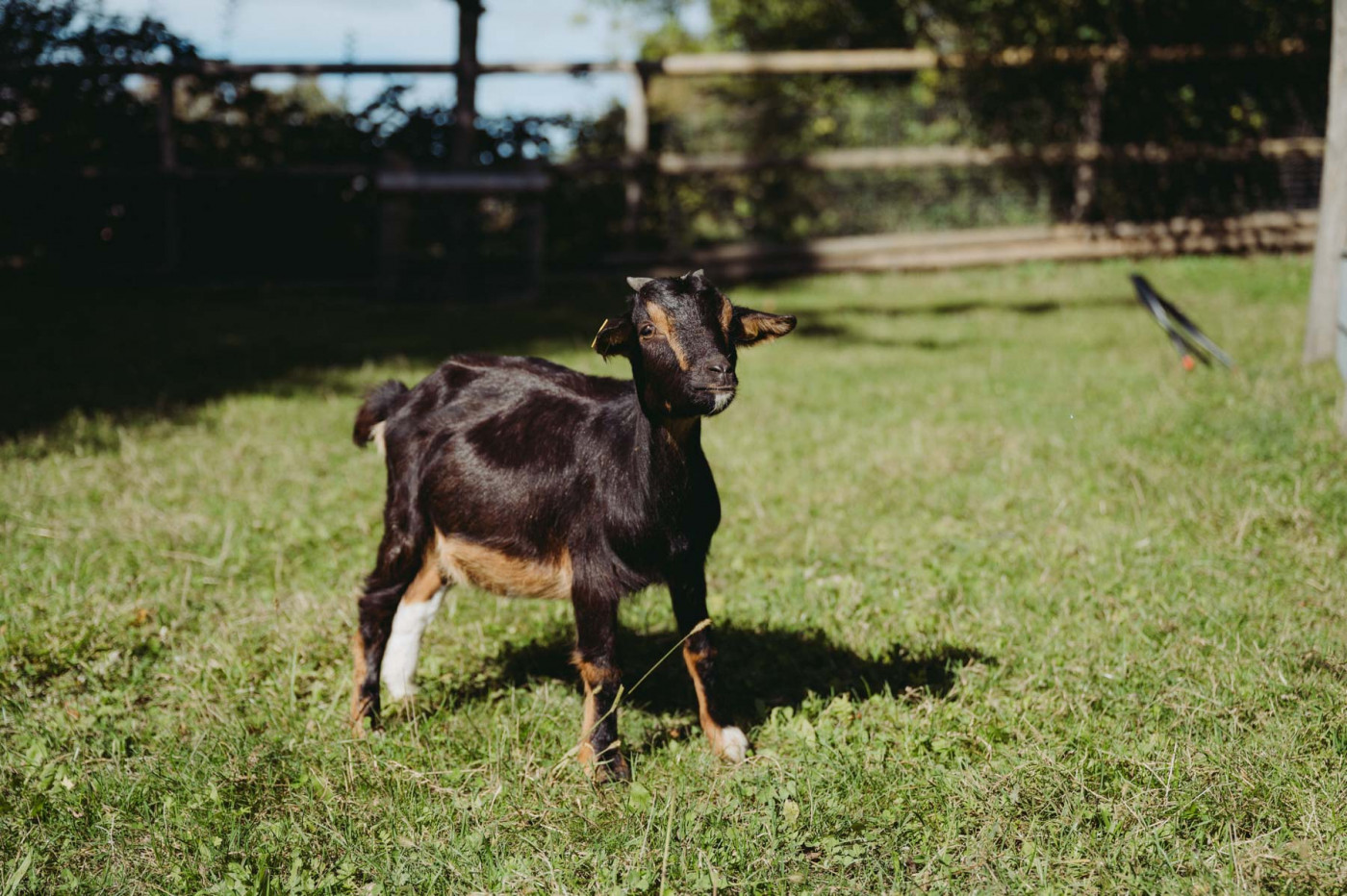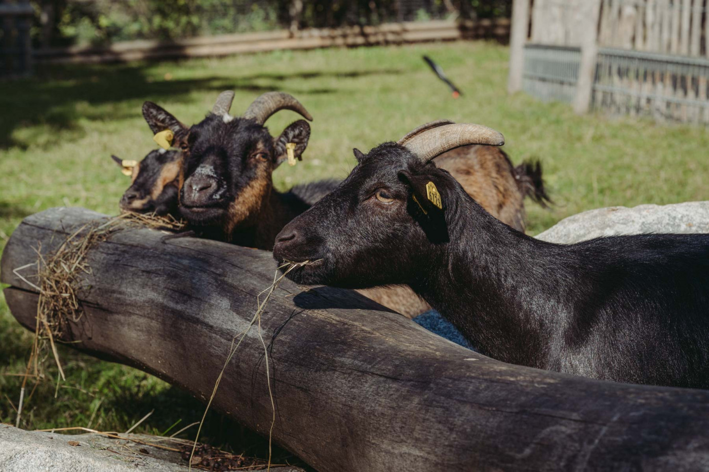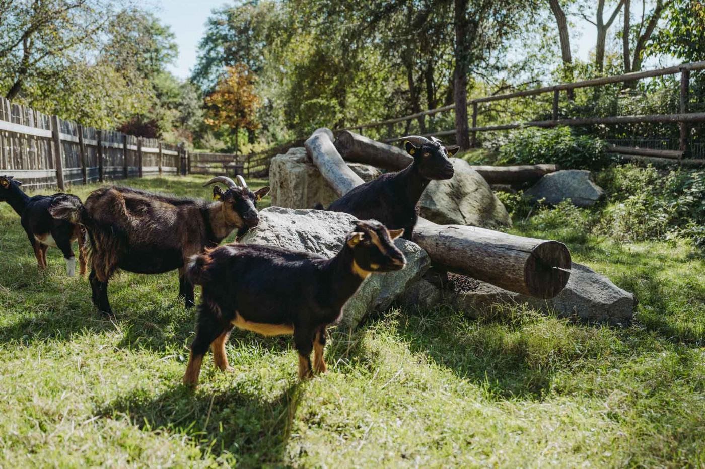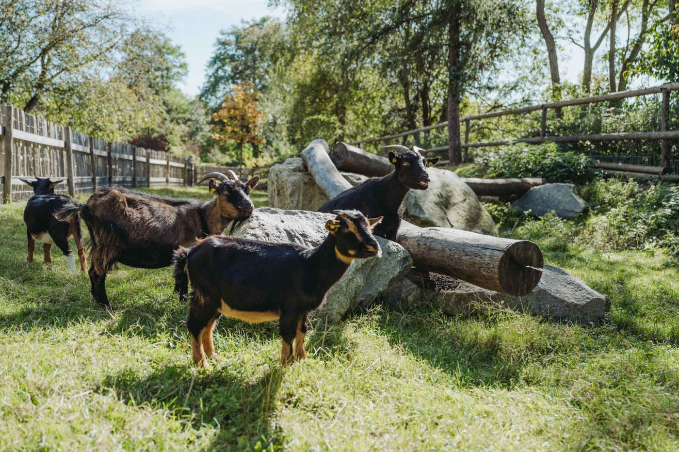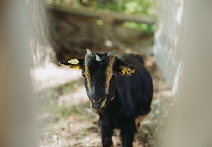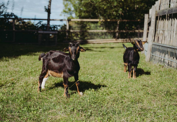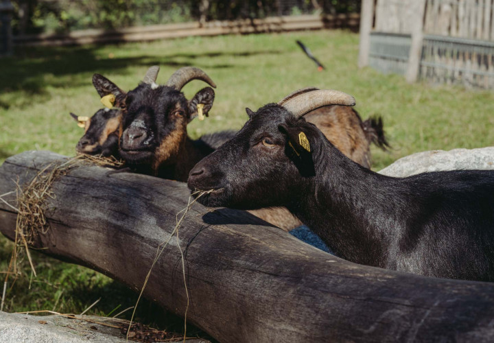 Laut und wild geht es bei unseren Ziegen oft zu. Extrem zutraulich und neugierig halten sie sich gerne in der Nähe des Zauns auf, sobald Besucherinnen auftauchen.