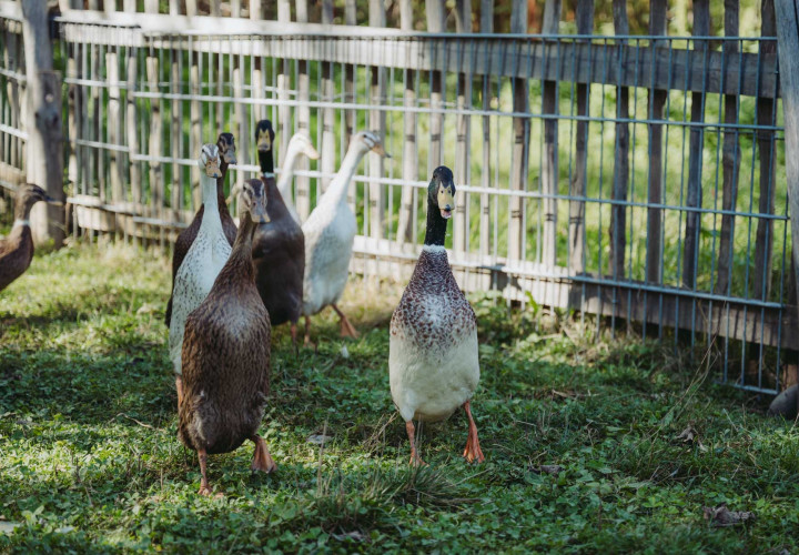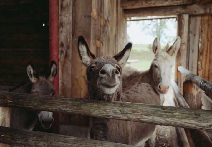 Barockesel und Hausesel, Cattles, Wollschweine, Deutsche Riesen und Meerschweinchen, Orpington Enten, Alpakas, Waliser, Schwarznasen, Zwergziegen, Hofhund Barney