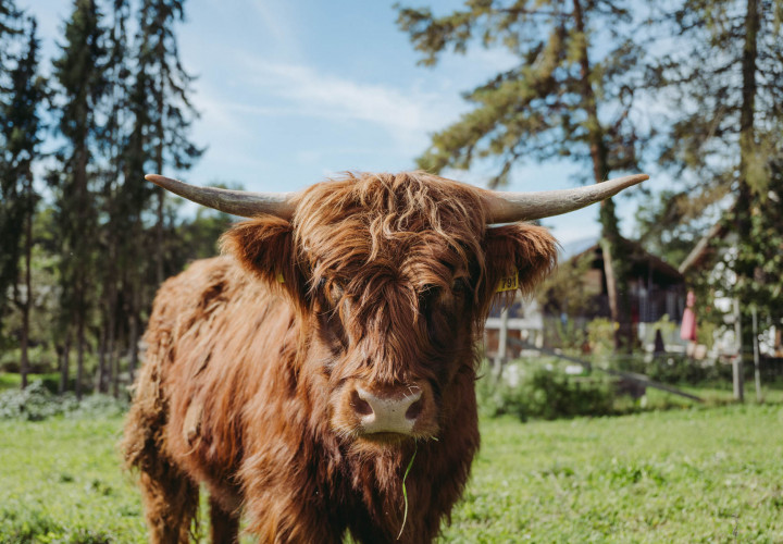 Minnie und Holly - das sind unsere größten und wohl auch beeindruckendsten Tiere am Landgut. Auch wenn die langen Hörner vor allem unseren kleinen Besucher nicht ganz geheuer sind - die beiden Highland-Damen lieben es gemächlich und bedächtig und begrüßen unsere BesucherInnen meist freundlich und sehr neugierig.